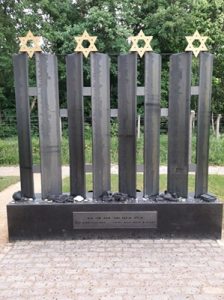 Kamp Vught werd in 1943 in gebruik genomen en heeft ruim anderhalf jaar als concentratiekamp gefungeerd. We zagen de tafels, waarop gedode gevangenen een “autopsie” kregen, de ovens waarin hun lichamen verbrand werden en de asput waar na de oorlog de naast het crematorium gevonden as- en botresten begraven zijn in een groot massagraf. Grote indruk maakte het Kindermonument: 4 ijzeren pilaren met de namen en leeftijden van 1297 kinderen, die vanuit Vught weggevoerd zijn naar Sobibor, om daar na aankomst meteen in de gaskamers gedood te worden.