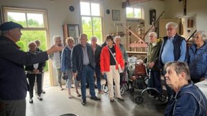 In 4 groepen, begeleid door een gids, bezochten we de diverse authentieke boerderijen en ambachtsgebouwen rondom het kleine dorpsplein. We namen o.a. een kijkje bij de smidse, de klompenmaker, de zagerij, de melkfabriek en de destructor, waar we in het kort hoorden dat daar karkassen van dode dieren verwerkt werden tot allerlei producten zoals bv. diermeel dat dan weer o.a. aan de varkens gevoerd moest worden. Ook namen we een kijkje in een ouderwets schoollokaal, een café, snoepwinkeltje en een kamer met diverse ouderwetse kledingstukken zoals doopjurkjes, gebreide onderbroeken, Brabantse poffers (mutsen) en zelfs een originele “snelzeiker!” Een feest der herkenning aan de diverse opmerkingen te horen!