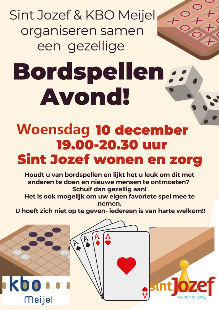Sint Jozef en KBO Meijel organiseren samen een gezellige bordspellenavond – een avond vol plezier, ontmoeting en spel voor jong en oud!